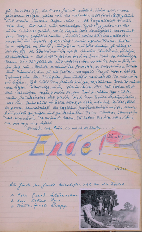Täler u. Höhen an uns vorüberziehen und voll ehrlicher, reiner Freude gaben wir uns ganz diesem Abschiedsdebut der Natur hin! Da unsere inneren Organe aber noch nach flüssigen Stoffen verlangten, kehrten wir unterwegs noch einmal in eine Gastwirtschaft ein, tranken, aßen, lachten und scherzten, beglichen unsere Schulden und schrieben an unseren neuen Präsidenten und den neuen Wanderführer Ansichtskarten mit großem Inhalt. Aber dann ging es endgültig, nachdem wir noch Bilder verknipst hatten, den heimatlichen Gefilden entgegen, untermalt von „lieblichem Chorgesang“ unseres lieben kleinen Bernhard, der gern auf der „Wutz“ herumgeritten wäre. Und mit Kochtopfgeklapper und erlebnisreichen Stunden kehrten wir mit den letzten Sonnenstrahlen in leiser Wehmut in das liebe, traute Heppenheim zurück und dankten mit frohen Herzen unserem Herrn und Schöpfer für diese schönen fröhlichen Stunden des verflossenen Wandertages! Unser Innerstes, aber war in heiligste Freude getaucht und suchte in edlen Worten den Ausdruck des Dankes zu finden, der Jenem gebührt, der so allmächtig und Allweise die Geschicke der Menschheit lenkt und in lieber Vertrautheit den Menschen Liebe, Freude und Güte spendet und uns lehret, soweit es Menschen möglich ist ihm gleichzutun! In uns und mit uns sang ein herrlicher Chor, das schöne Lied: